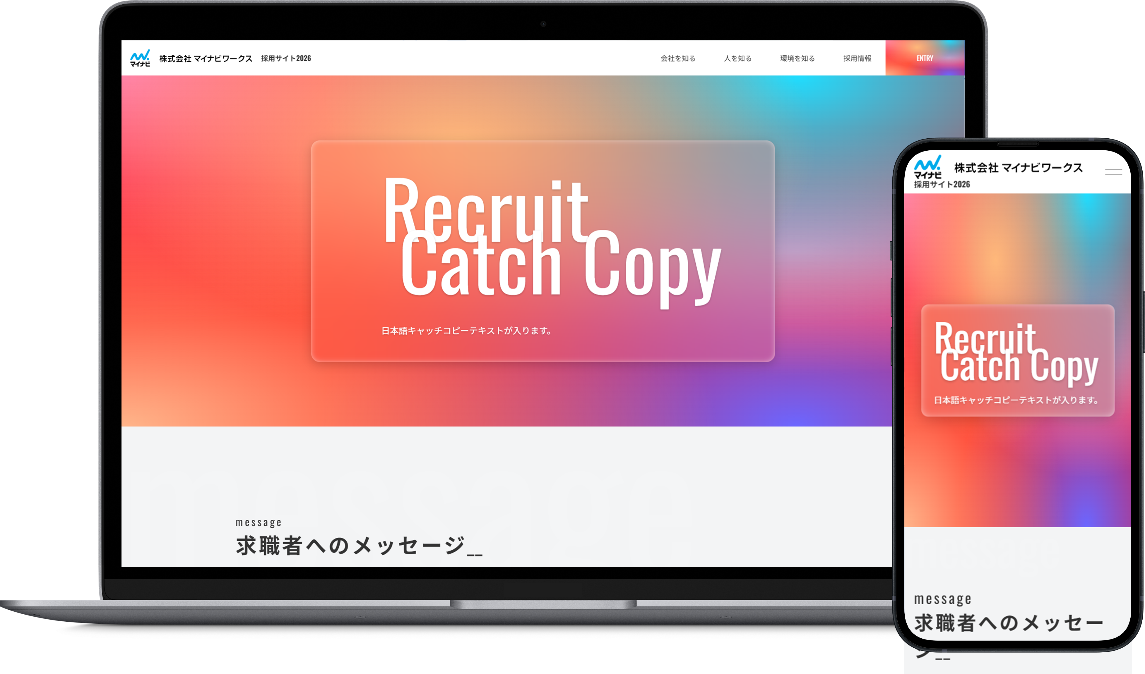 余計な要素のないシンプルなデザインですが、カラフルなグラデーションが華やかさを演出しています。洗練された雰囲気の採用サイトとして求職者にアピールできます。また、写真を使用しないため、言葉で伝える表現が強調されることも、このテーマの特徴の一つです。